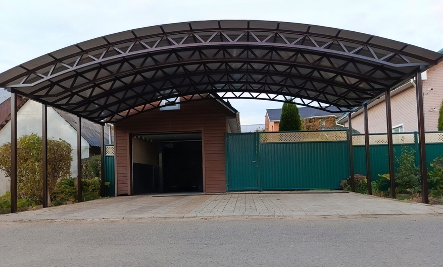 Арочный навес с поликарбонатом для стоянки авто в загородном доме Арт-672